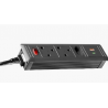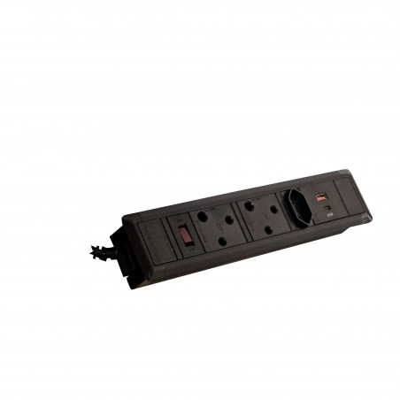 Always available multiplug mounted in a desk or counter. Includes 15A overload switch. Suitable for work surfaces 15mm to 30mm thick.
