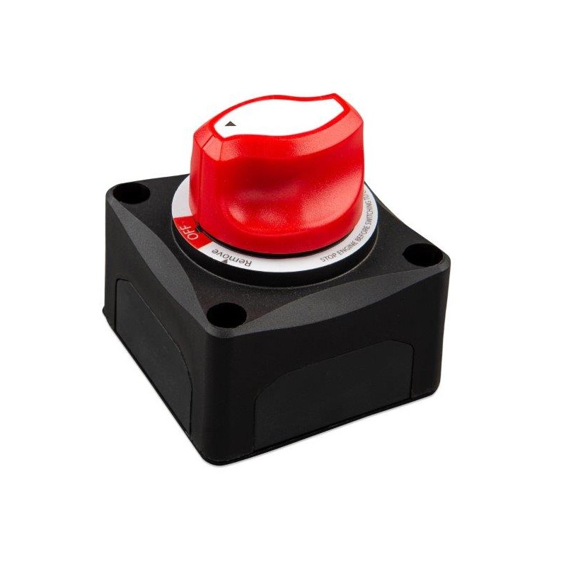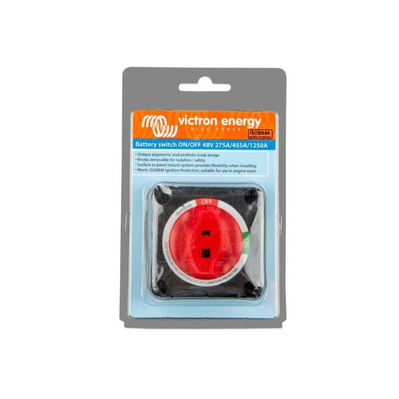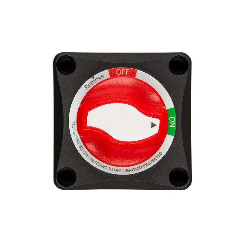 The Battery Switch ON/OFF 275A is suitable for battery systems up to 48V. It has a unique ergonomic and aesthetic knob design. The knob is removable for isolation or safety purposes.
