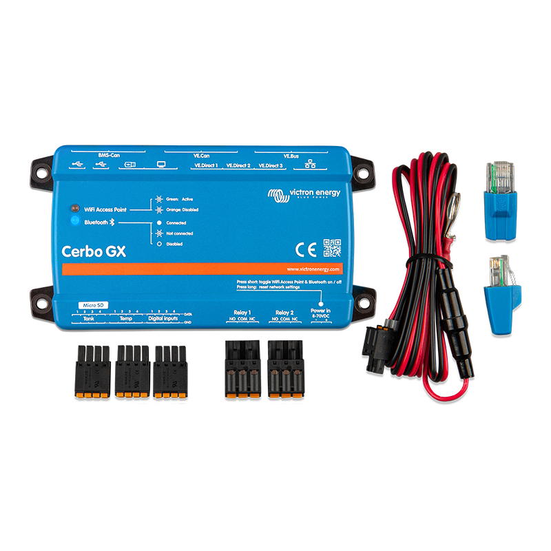 This all-new communication-centre allows you to always have perfect control over your system from wherever you are and maximises its performance. Simply connect through our Victron Remote Management portal, or access directly, using the separate GX Touch 50, a Multi Function Display or the VictronConnect app thanks to its added Bluetooth capability. This latest addition to the GX-range combines all the best of connectivity, redefining smart power solutions in every way.