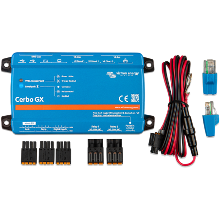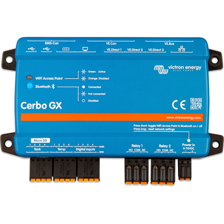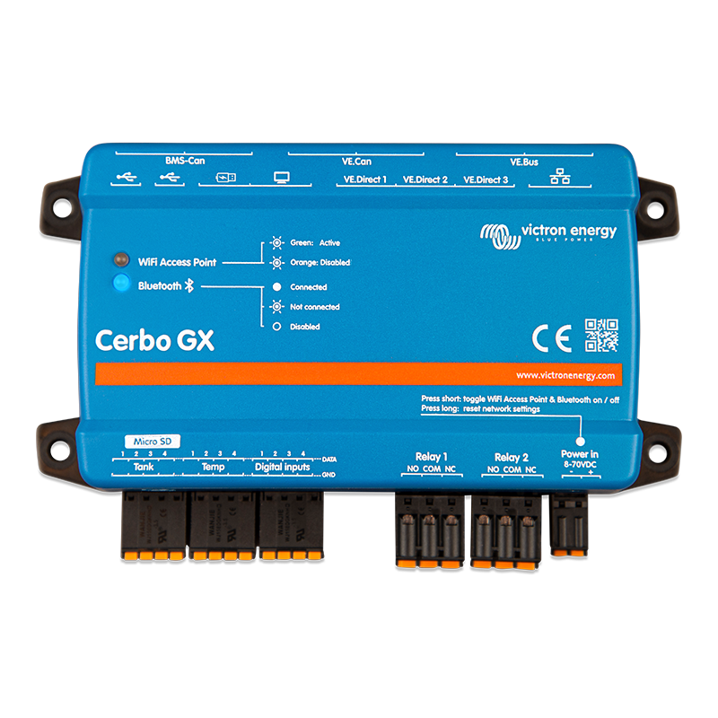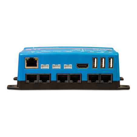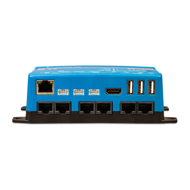 The Cerbo GX maximises the performance of your systems components in real-time and keeps them in perfect tune. With its Dual Core Processor and the addition of an extra CAN-bus port you can now support even bigger systems; closely follow managed (lithium) batteries while the second port can support up to 25 simultaneously connected VE.Can solar chargers. The new NMEA 2000-out support has the GX easily integrated into any boats network. Four tank- and four temperature ports as well as 3 VE.Direct ports, 3 USB ports, 4 digital inputs and 2 relays allow you to expand control to a new level. Maximising systems performance was never this easy